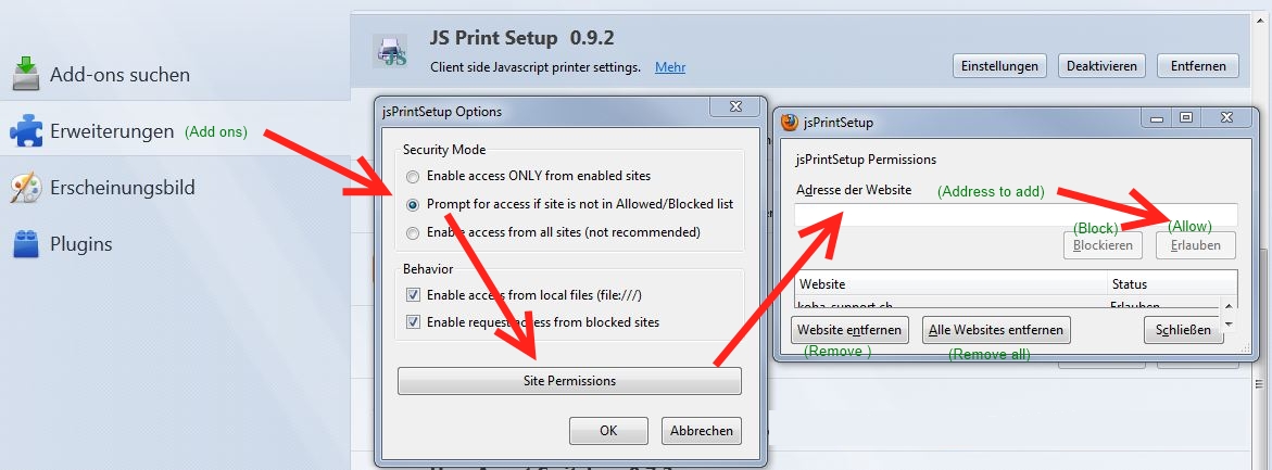 2. Install the JS Print Setup add-on in Firefox on the Ubuntu client and add your Koha staff URL to the list of allowed sites in JSPrintSetup preferences (see Screenshot).